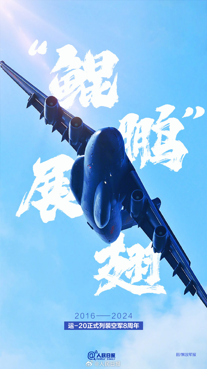 2016年7月6日,国产运输机运-20正式列装空军航空兵部队。亮相阅兵场、驰援震区救灾、接迎志愿军烈士遗骸回家……运-20飞越崇山峻岭,跨越广阔大洋。运20列装空军8周年,加油“鲲鹏”,未来可期!