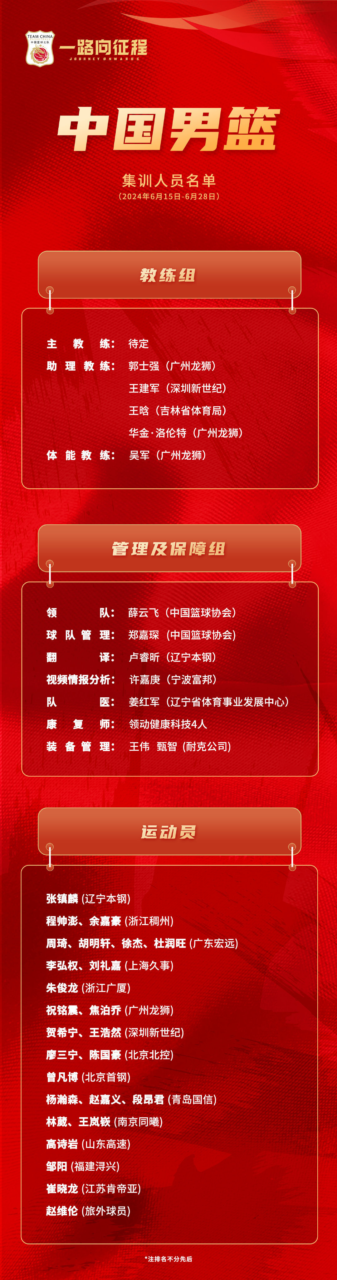 据中国篮球协会消息,为进一步加强中国男篮队伍建设,中国篮球协会将于2024年6月15日至6月28日在上海市竞技体育训练基地(崇明)组织集训。