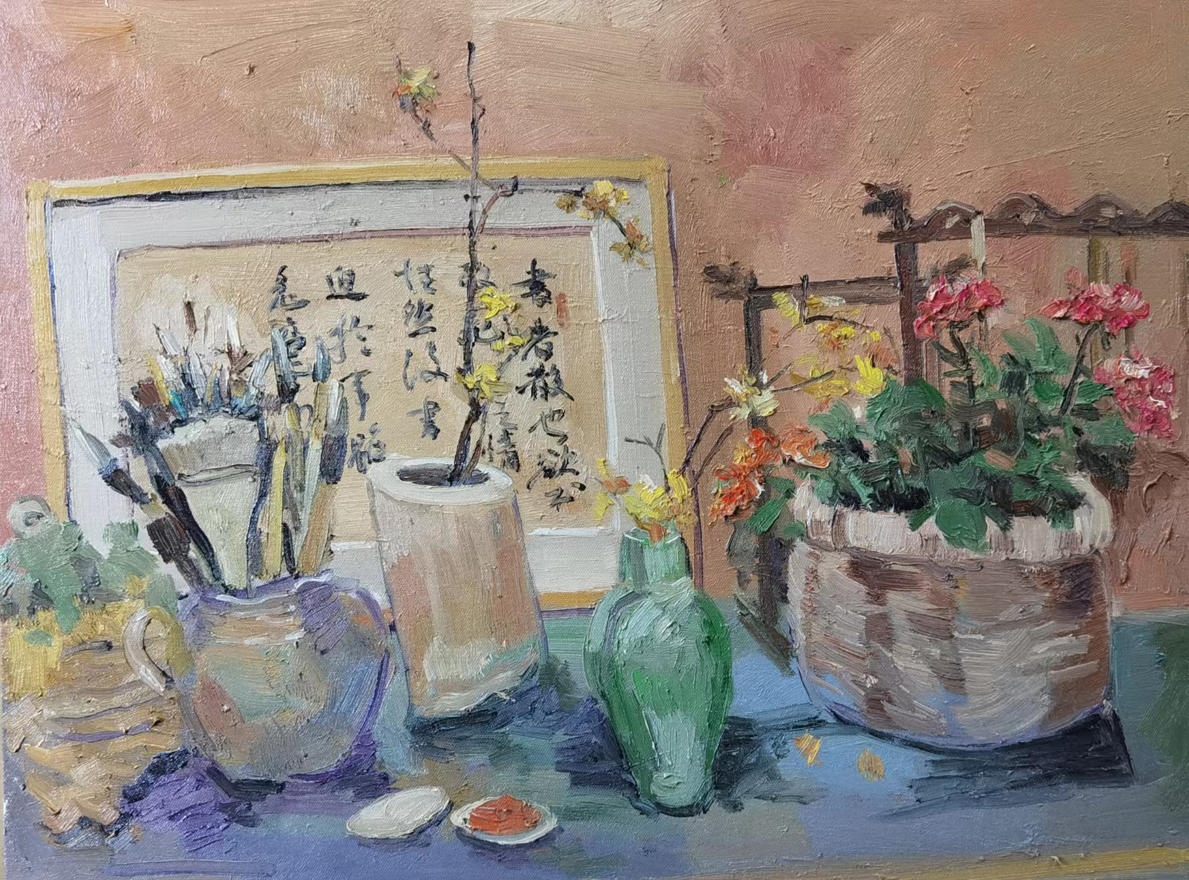 作者在午后到访书法家罗进先生的工作室,工作室角落放满书法作品、笔墨和插花,学生学习书法之后无序的摆放却让人感到一丝和谐,在工作与创作之余,作者用速写的方式快速记录下此景。 创作中,为准确地再现阳光午后艺术家的工作环境,以现场静物无序的摆放、暖色调和书法作品作为背景、毛笔和画笔随意插到罐子里,写完作品后印泥还未盖上,桌面上散落点点花瓣,体现了书法家全身心地忘我创作和教学,就在这样优雅而和谐的环境,艺术家培养了许许多多青少年书法爱好者,这些当许多中学生频频在省市大赛屡获殊荣,为书法的传播做出了贡献。
