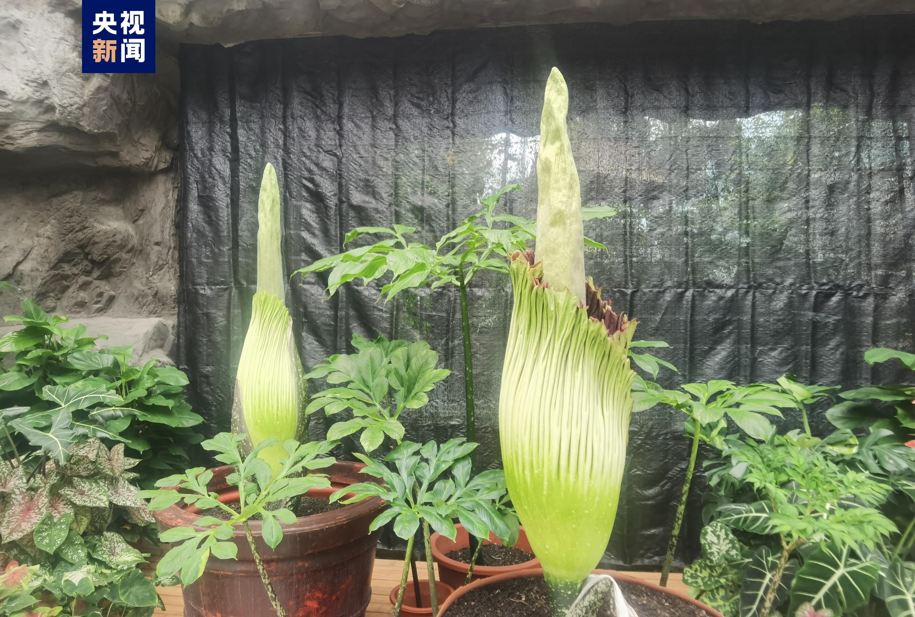 7月19日,在北京国家植物园(北园)展览温室内,一株巨魔芋正在开花,就在它的旁边,另一株巨魔芋也已经含苞待放。这是国家植物园近期开花的第二株巨魔芋。本次开花的巨魔芋与7月6日开花的第一株巨魔芋以及即将开放的第三株巨魔芋形成了世界上首次人工栽培状态下的巨魔芋群体开花。