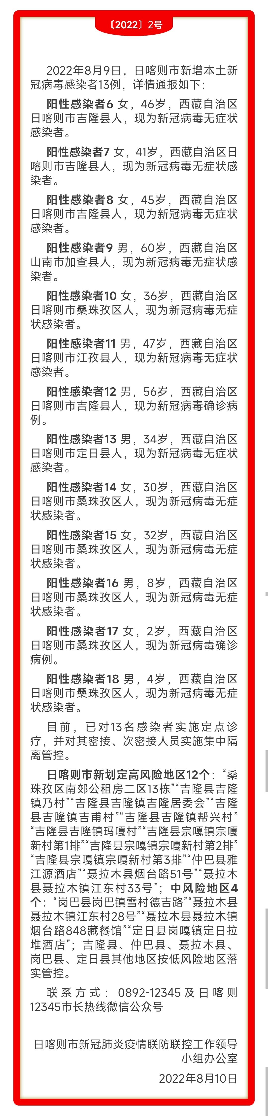 2022年8月10日,西藏日喀则市新冠肺炎疫情工作领导小组办公室发布通报,2022年8月9日,日喀则市新增本土新冠病毒感染者13例。全文如下: