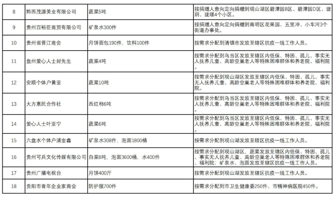 2.接收物资捐赠18批次,主要包括蔬菜、鸡蛋、矿泉水、方便面等生活物资和防护服等防疫物资,已分配到各区(市),具体情况详见附件。