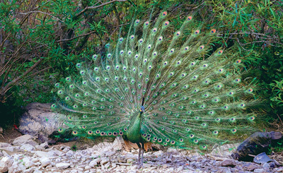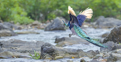 初夏时节,云南省楚雄彝族自治州双柏县恐龙河州级自然保护区内,一只羽色鲜艳的绿孔雀落在一处山谷河滩旁,鸣叫,踱步,倏忽展开硕大的尾屏。摄影师连按快门,捕捉下这一瞬间。