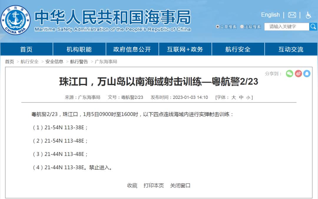 广东海事局发布航行警告,1月5日9时至16时,珠江口万山岛以南海域进行射击训练,禁止驶入。