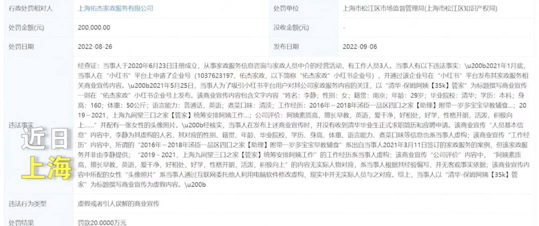 2021年6月16日,上海市松江区市场监督管理局对涉事家政公司以涉嫌虚假宣传立案调查。