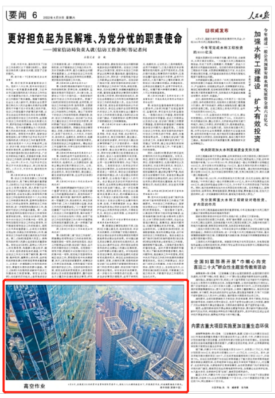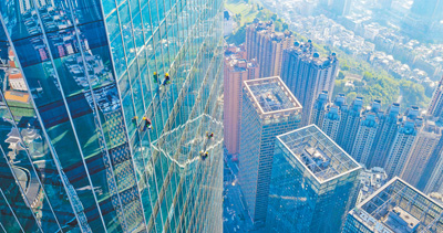 4月8日,在高度335米的贵州省贵阳国际贸易中心,清洗工人从楼顶垂直而下,开展高空作业,对玻璃幕墙进行清洗。