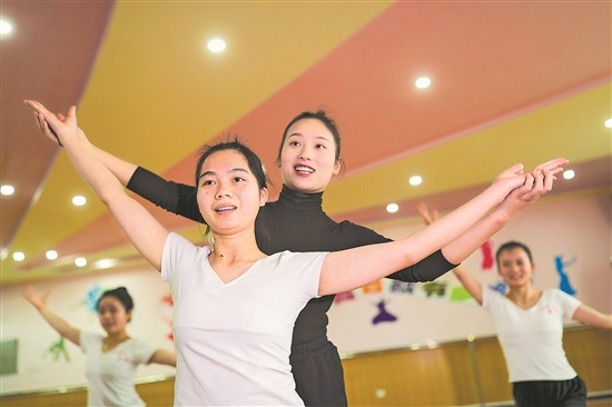 2月17日,在贵州省黔东南苗族侗族自治州岑巩县中等职业学校,老师在指导幼儿保育专业的学生练习舞蹈。近年来,岑巩县十分重视职业教育工作,鼓励学校与东西部协作企业、市场前景好的企业等签订“订单式”职业教育人才培训,拓展了学生的就业渠道。