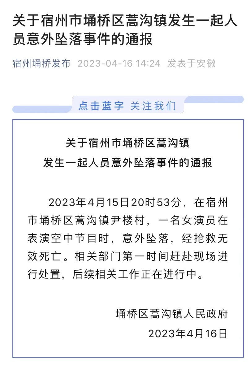 2023年4月15日20时53分,在宿州市埇桥区蒿沟镇尹楼村,一名女演员在表演空中节目时,意外坠落,经抢救无效死亡。相关部门第一时间赶赴现场进行处置,后续相关工作正在进行中。