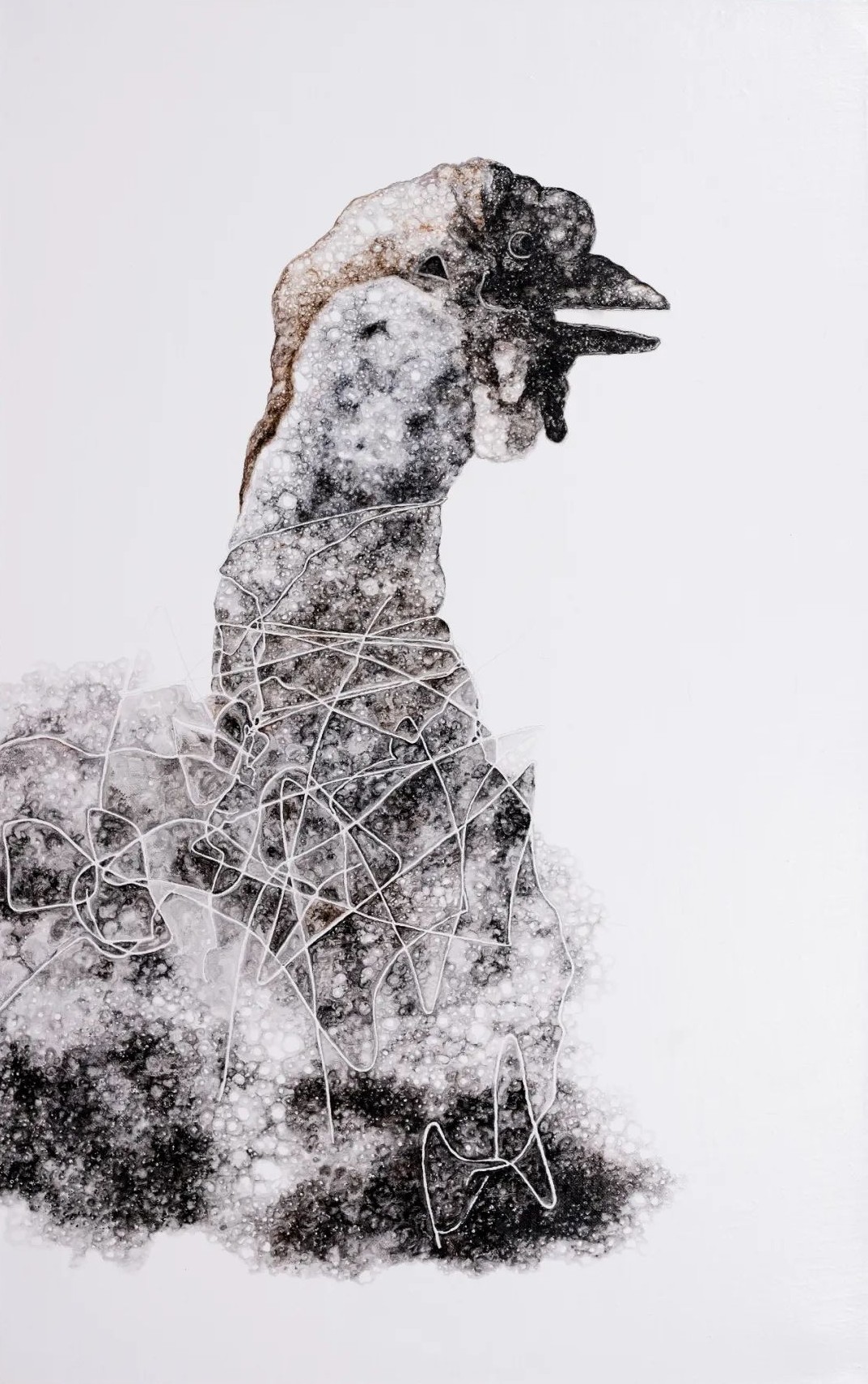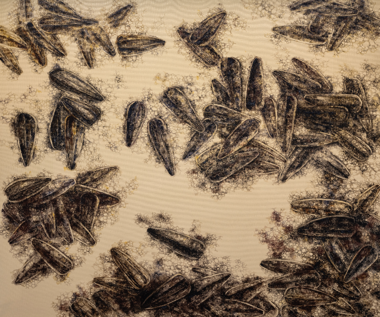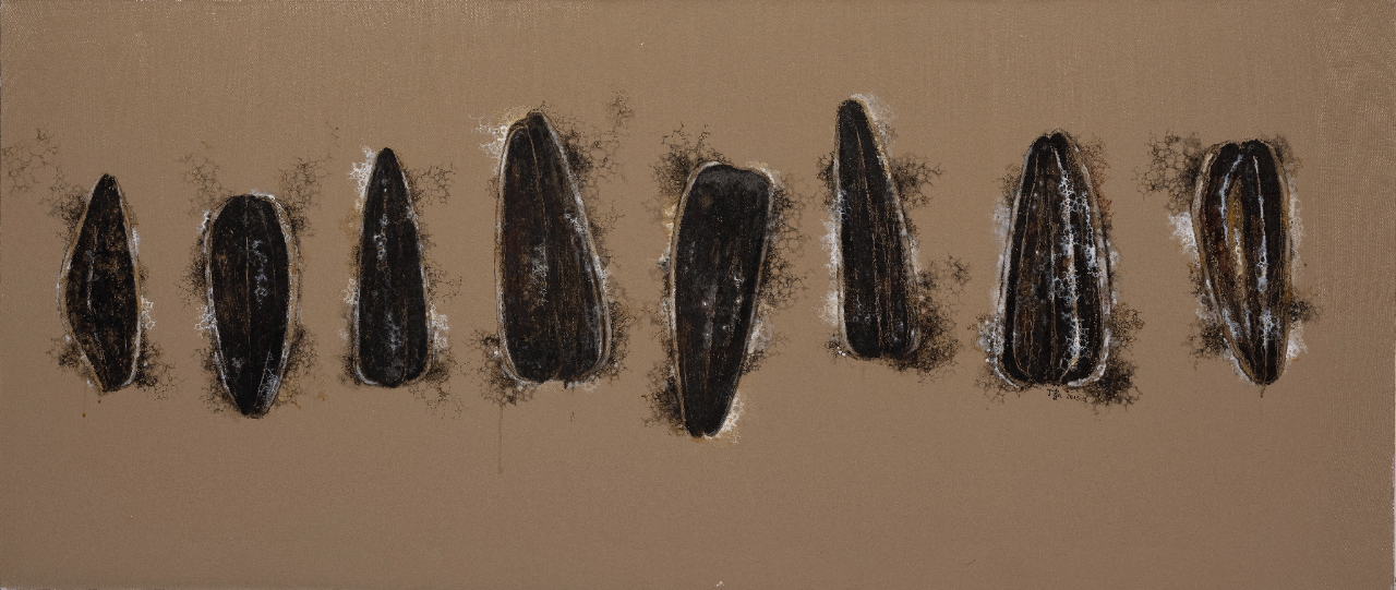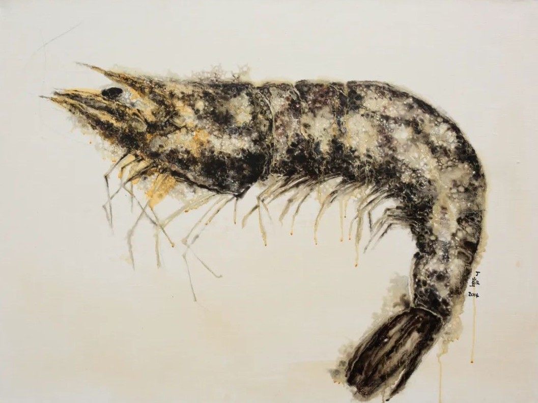 丁凯的作品应当被视作一个日常生活的“无色集市”, “无色”画面主要描绘着三种内容:一是丢弃物,如日常生活中开始腐坏的葵花籽、莲蓬、鱼、虾、蜥蜴等;二是密集物,如卵、巢等;三是以花鸟本体进行变化的“机械物”。在日常的绘画创作中,他注重绘画语言的形式与视觉探索,将“无色之物”的形式因素提取出来,将其抽象化、陌生化,使其传达出异样、怪诞的审美感受,更注重绘画过程所带来的独特的心理体验。