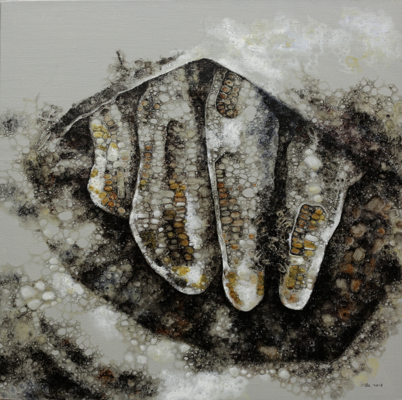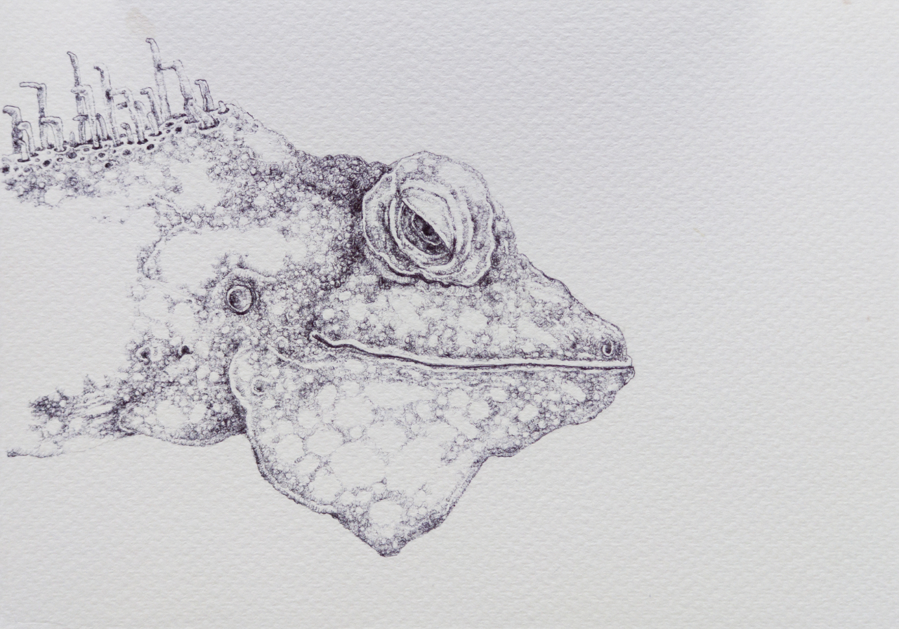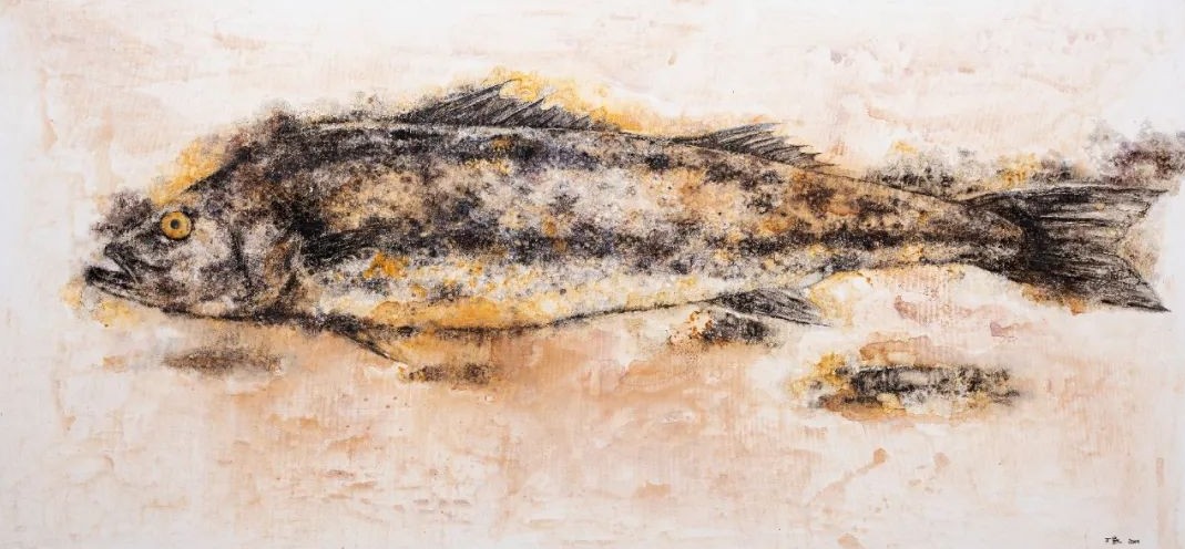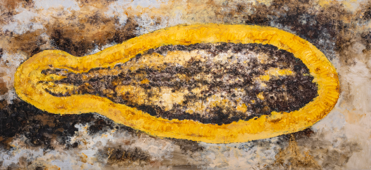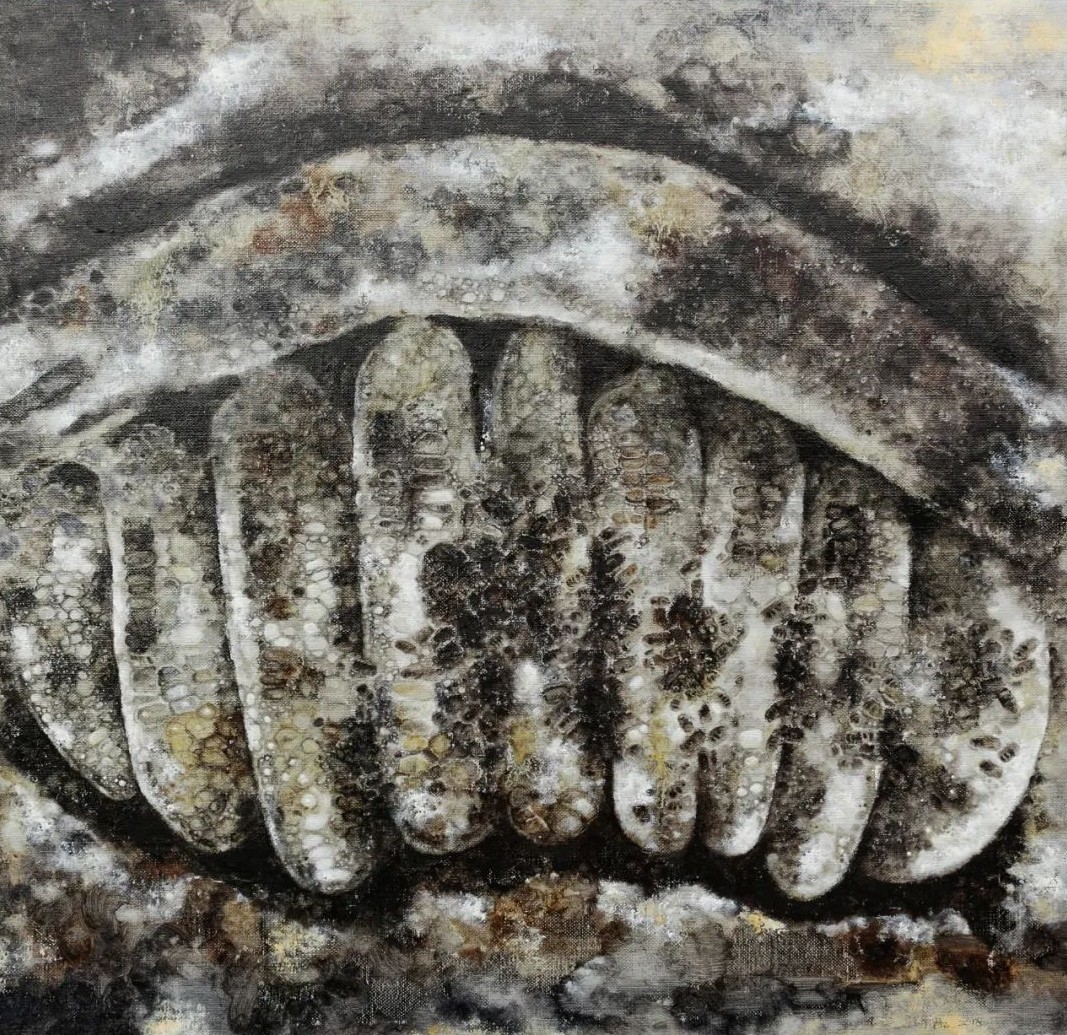丁凯的作品应当被视作一个日常生活的“无色集市”, “无色”画面主要描绘着三种内容:一是丢弃物,如日常生活中开始腐坏的葵花籽、莲蓬、鱼、虾、蜥蜴等;二是密集物,如卵、巢等;三是以花鸟本体进行变化的“机械物”。在日常的绘画创作中,他注重绘画语言的形式与视觉探索,将“无色之物”的形式因素提取出来,将其抽象化、陌生化,使其传达出异样、怪诞的审美感受,更注重绘画过程所带来的独特的心理体验。