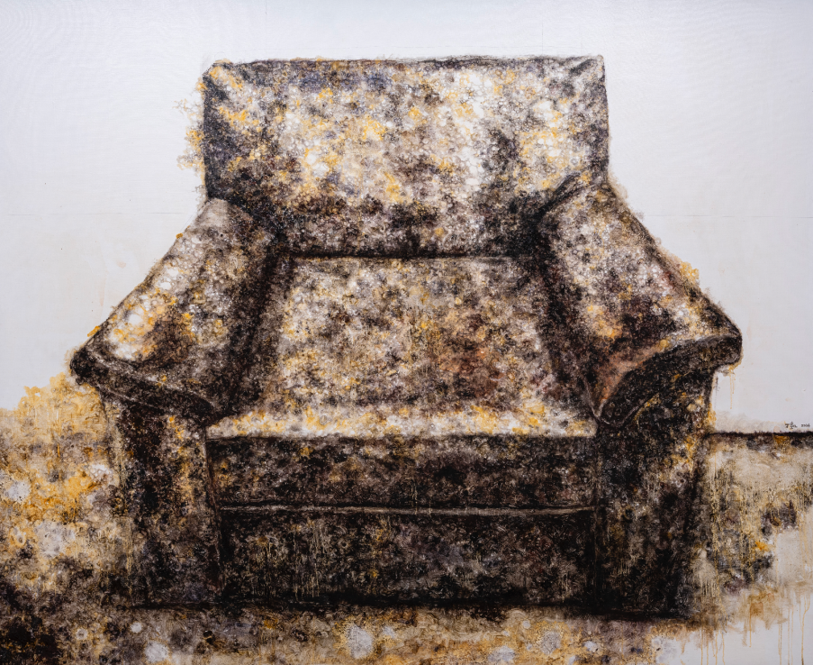 每次去化纤厂艺术区,不论晴雨、无论炎寒,都有两位雷打不动的艺术家在自己的工作室里或创作、或喝茶。一位是幺哥(陈启基),另一位就是丁凯。他俩的工作室在化纤厂一楼,刚好挨在一起,一左一右,都有大落地窗可以被阳光直射。如果化纤厂要颁发一个“最卷劳模创作奖”,这二位还真不相上下。丁凯画室的门不会关上,一直都是轻掩着的。依丁凯的说法,其创作可以视为四个动作:想象图像-展开绘画-设置障碍-越过障碍。前两个动作似乎是绘画行为中的合理体现,但在绘画中为画面设置障碍倒鲜有。