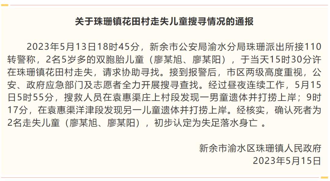 2023年5月13日18时45分,新余市公安局渝水分局珠珊派出所接110转警称,2名5岁多的双胞胎儿童(廖某旭、廖某阳),于当天15时30分许在珠珊镇花田村走失,请求协助寻找。接到报警后,市区两级高度重视,公安、政府应急部门及志愿者全力开展搜寻查找。经过昼夜连续工作,5月15日5时55分,搜救人员在袁惠渠庄上村段发现一男童遗体并打捞上岸;9时17分,在袁惠渠洋津段发现另一儿童遗体并打捞上岸。经核实,确认死者为2名走失儿童(廖某旭、廖某阳),初步认定为失足落水身亡 。