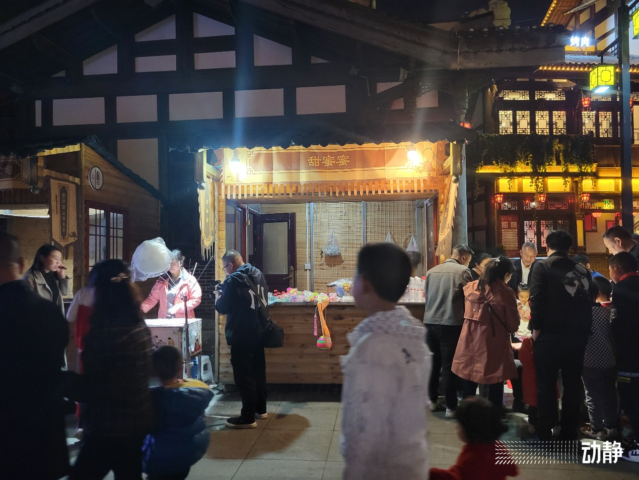 露天电影院火了,旁边的步行街人气也上来了,不少商家已经嗅到了商机。“这几天,单是棉花糖每天就能卖700、800块钱,糖画的生意更好。” 步行街商户谢女士笑着说。