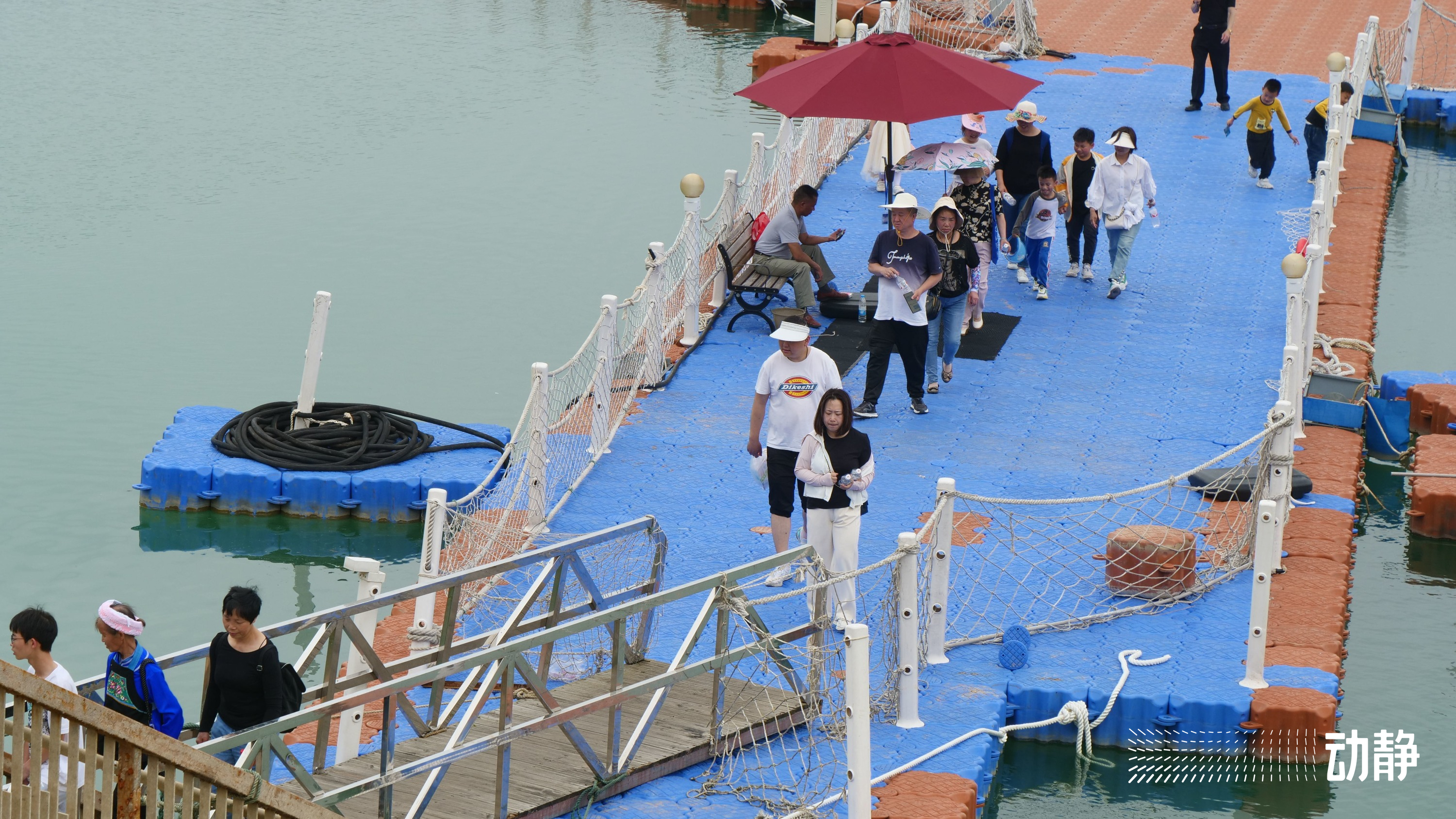 景区内,游客们或漫步在美丽的蝴蝶漂浮栈道上,或搭乘摩托快艇体验水上游玩项目,或乘坐游船欣赏“两岸青山相对出”的奇妙景象。