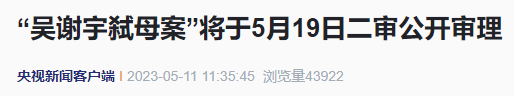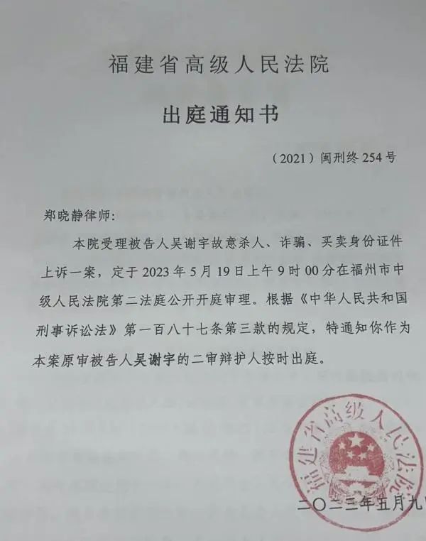 据央视新闻客户端11日消息,记者获悉,被告人吴谢宇故意杀人、诈骗、买卖身份证件上诉一案,将于2023年5月19日上午9时在福州市中级人民法院第二法庭公开开庭审理。