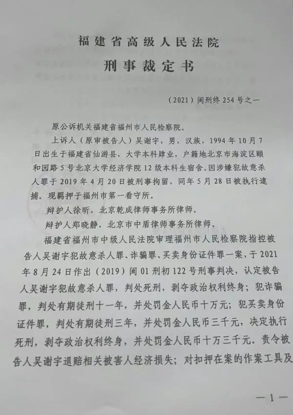 2021年8月26日上午,福建省福州市中级人民法院依法对被告人吴谢宇故意杀人、诈骗、买卖身份证件案进行一审公开宣判。以被告人吴谢宇犯故意杀人罪、诈骗罪、买卖身份证件罪,数罪并罚,决定执行死刑,剥夺政治权利终身,并处罚金人民币十万三千元。