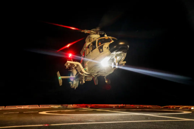 夜色如墨,红灯闪烁,直升机疾行如风。根据塔台指令,直升机抵达目标海域,并与舰船建立通联,准备开展夜间着舰训练。