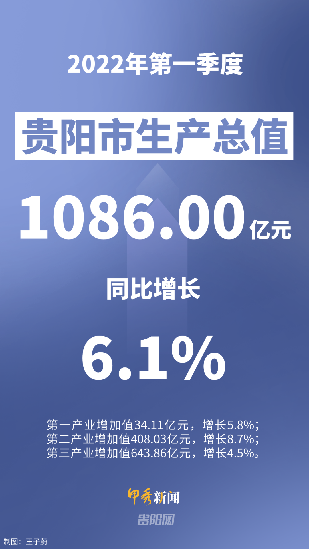 4月24日,贵阳市统计局发布2022年一季度贵阳市生产总值:根据市(州)生产总值统一核算结果,2022年一季度贵阳市生产总值1086.00亿元,同比增长6.1%。