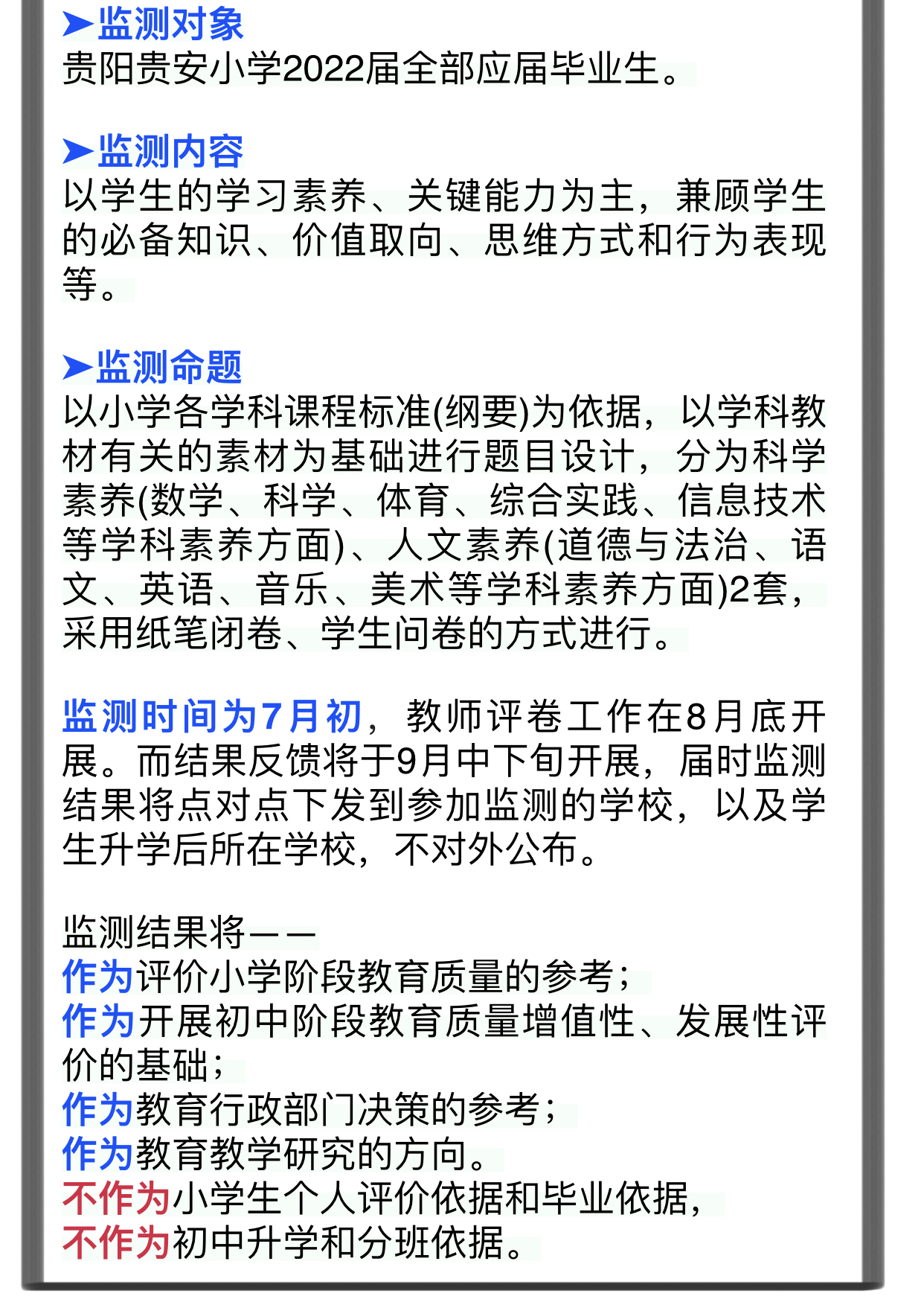 ▲从2022年起,贵阳贵安将开展小学六年级学生综合素养监测工作,六年级下学期不再举行区级、校级毕业考试。