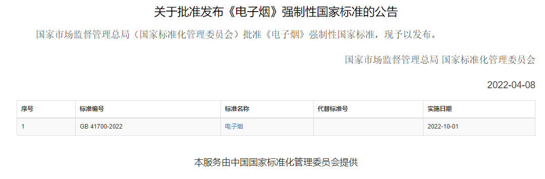 ▲市场监管总局发布,国家市场监督管理总局(国家标准化管理委员会)批准《电子烟》强制性国家标准,自2022年10月1日起实施。其中明确,所有的电子烟产品都必须依照国标进行生产,并按照国标允许添加的101种添加剂进行限量添加,不应使电子烟呈现除烟草外的其他风味,烟碱总量不高于200 mg。