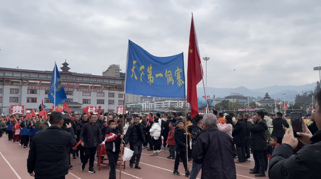 在两汪村和仁吉村的比赛接近尾声时,将于15时开赛的口寨村和车江五村村民已经组成方阵,拉着横幅、擂着大鼓,绕场一周为各自的队伍加油造势。
