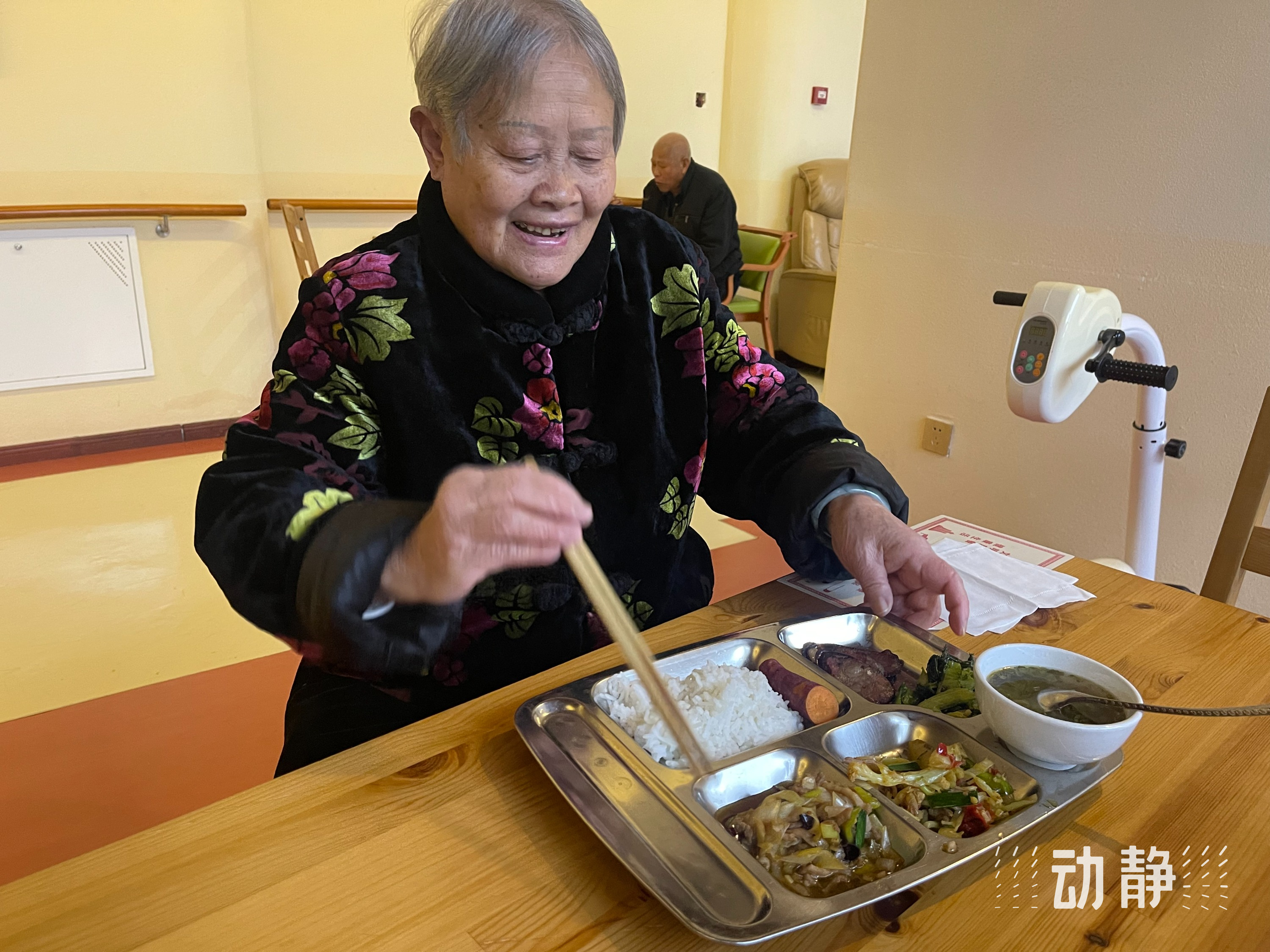 杨树群小步地穿过一楼的饭厅,扶着楼梯扶手慢慢往上爬,楼梯两侧的扶手被抹得发亮。每走到一处,老人都忍不住向记者赞美:“这里的卫生太好了,一点异味都没有。”