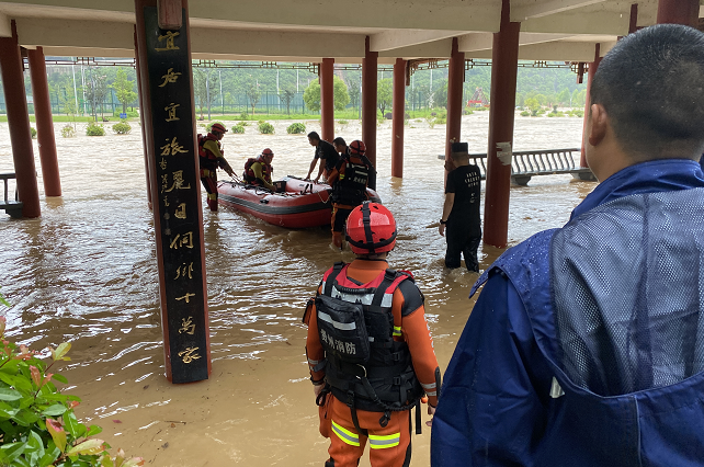 榕江县消防救援大队6车25人分成两个抗洪突击队及一个排涝组,有序展开救援行动。