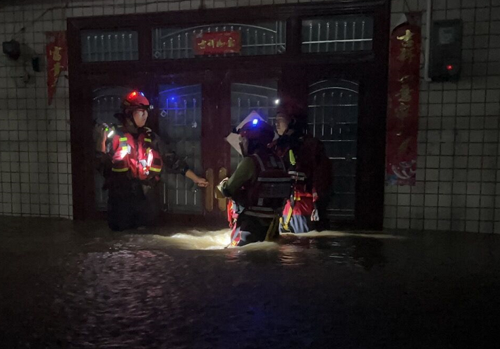 由于水流湍急,消防员只能相互搀扶,蹚水慢慢靠近第一户人家,将家中三人全部转移到安全地带,其中包括一名80多岁的老人。