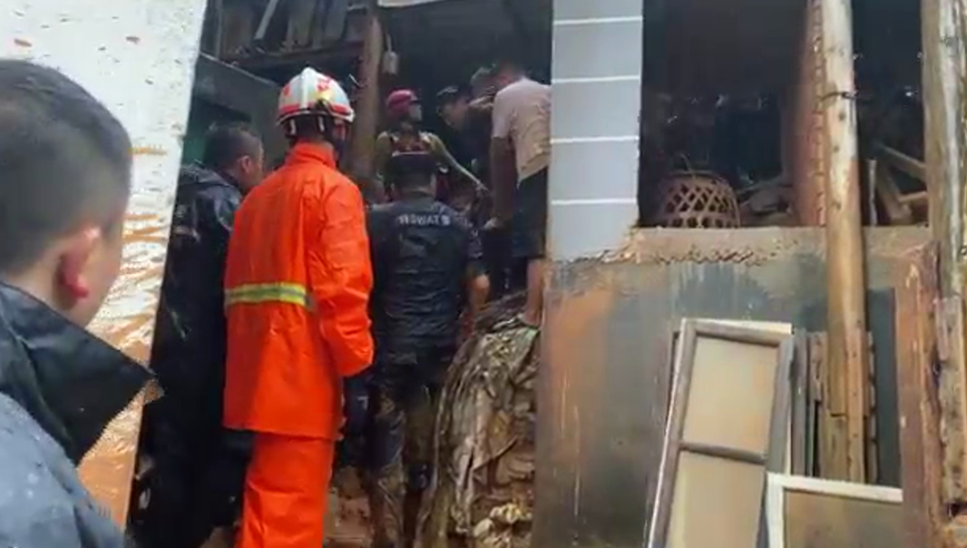 当天上午九点过钟,江县公安局特巡警大队的特警队员在县城三角井社区巡查灾情时,遇到一名男子求助称他家房屋因暴雨引发泥石流导致坍塌,他的父亲被困在屋内,请求救援。