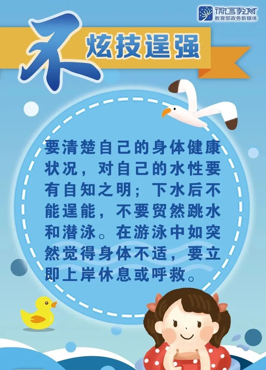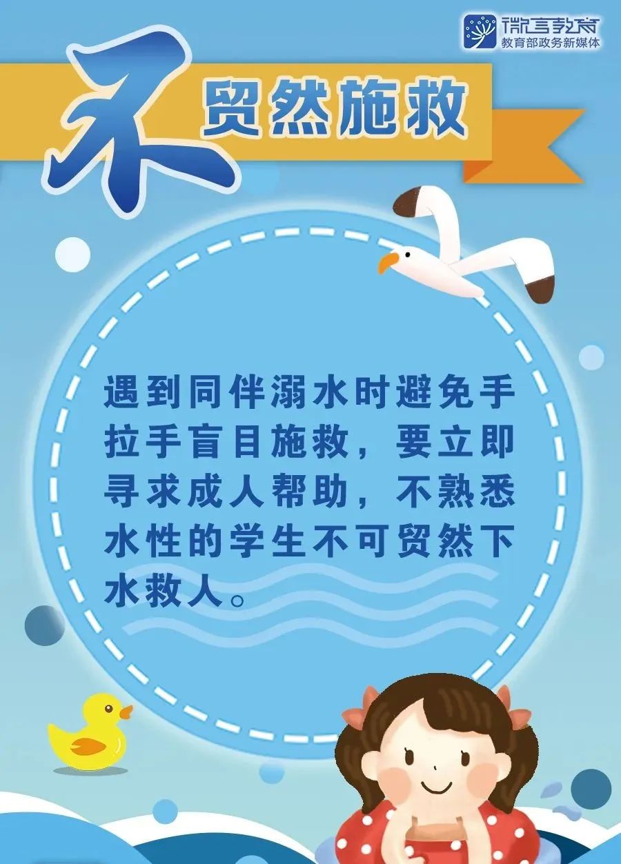 家长要切实履行好监护责任,对孩子进行防溺水安全教育,重点教育孩子牢记并做到“六不”:不私自下水游泳,不擅自与他人结伴游泳,不在无家长或教师带领的情况下游泳,不到无安全设施、无救援人员的水域游泳,不到不熟悉的水域游泳,不熟悉水性的学生不擅自下水施救。教育孩子遇到同伴溺水时避免手拉手盲目施救,要及时寻求成年人帮助。同时,家长朋友们在孩子外出时要知目的、知去向、知回时、知同伴。