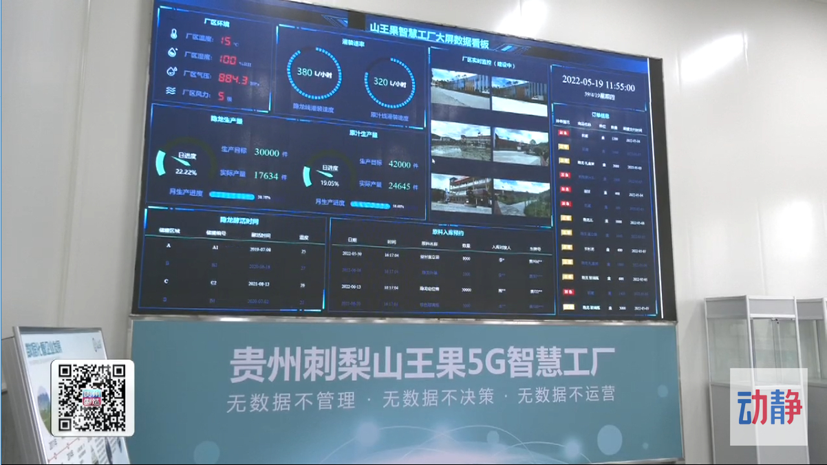 在贵州山王果健康实业有限公司的智慧大屏上,厂区环境、灌装速率、原料入库、订单信息等滚动显示。看板下——“无数据不管理、无数据不决策、无数据不运营”的醒目大字,体现了山王果公司打造5G智慧工厂的宗旨。