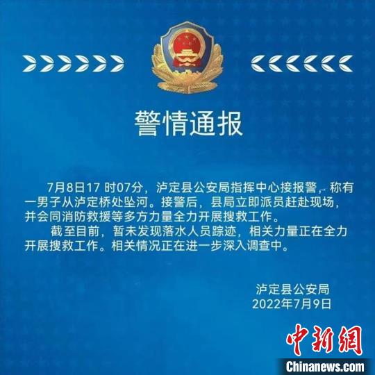 随后,泸定县公安局发布警情通报,称7月8日17时07分,泸定县公安局指挥中心接报警,称有一男子从泸定桥处坠河。接警后,立即派员赶赴现场,并会同消防救援等多方力量全力开展搜救工作。