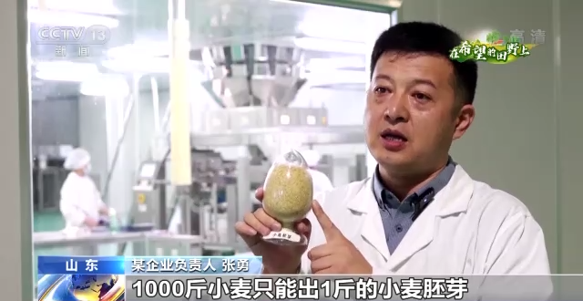 某企业负责人张勇:1000斤小麦只能出1斤的小麦胚芽,所以它很珍贵。过去在没有加工工艺之前,就是做饲料。这个胚芽里面含有很多的营养成分,但是没有充分地利用。