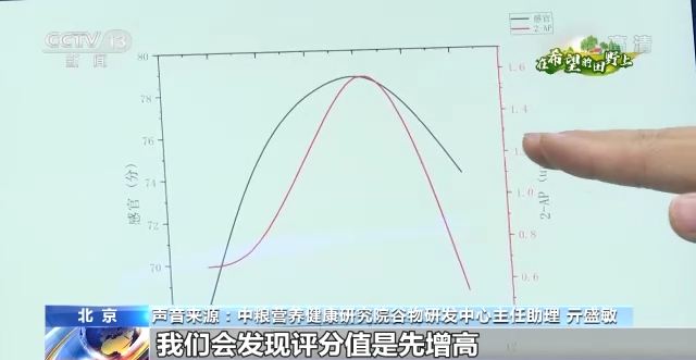 中粮营养健康研究院谷物研发中心主任助理 亓盛敏:随着大米加工的进行,首先黑色这个线,我们会发现评分值是先增高,但是在某一个点的时候达到一个峰值,继续加工的话它会有一个略微下降的趋势。同样的我们的香气在加工的过程中也是呈现了先逐渐增加再逐渐降低的一个过程。
