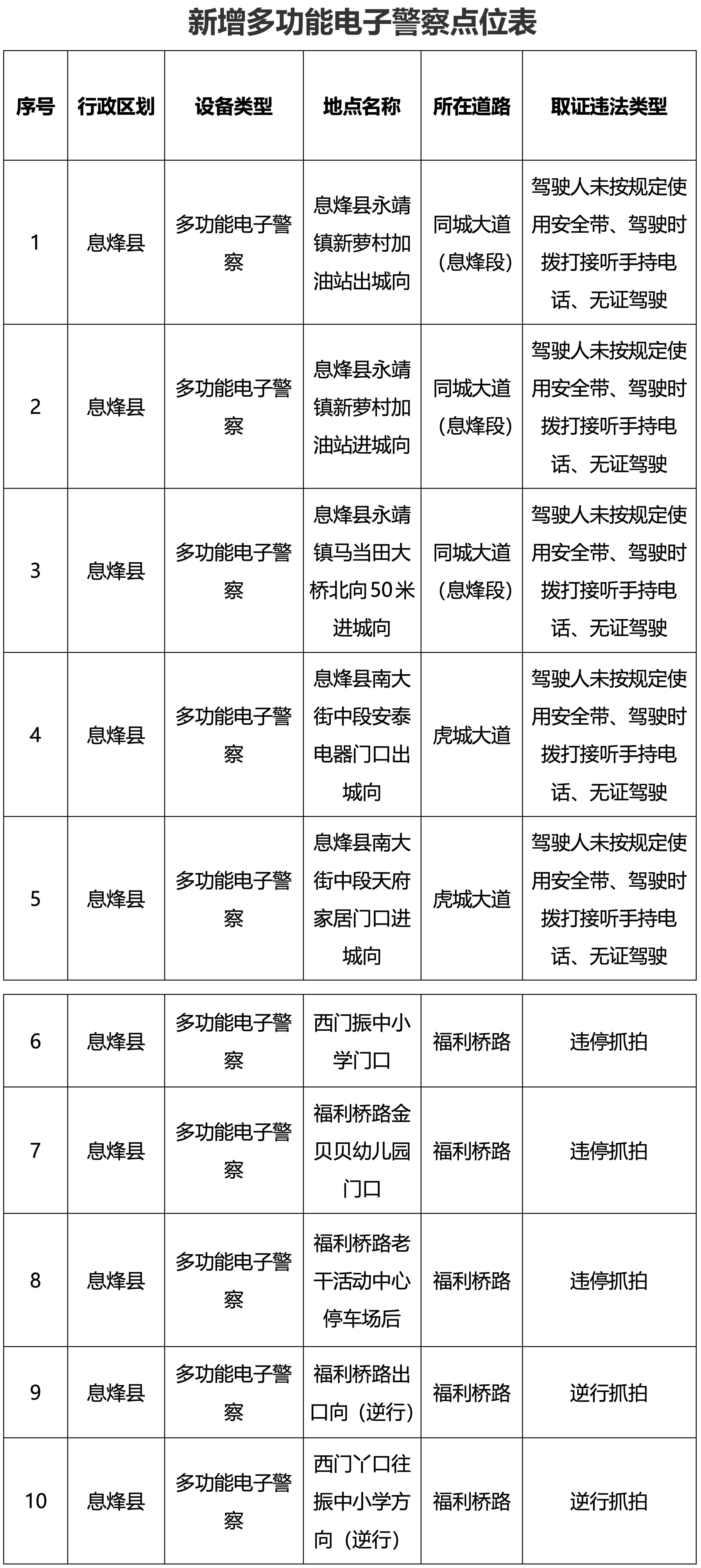 根据《中华人民共和国道路交通安全法》规定,对于设立电子监控设备的路段,应向社会公布安装点位,现将新增电子警察安装点位予以公示(详情见下表),望广大驾驶人依法、安全驾驶。