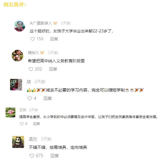 全国政协委员洪明基:建议把基础教育12年学制缩短到9年,其中小学5年、初中2年、高中2年。孩子们6岁可以上学,15岁可以高中毕业,19岁大学毕业后,爱学习的学生继续深造,不爱学习的则进入社会,结婚生娃和事业发展互不冲突。另外,校企可以联合办大学,根据社会需要重新编写教材,教学内容要跟着时代常换常新。让孩子一进入大学就知道未来的就业方向,理论学习和工作实践各占一半学时。