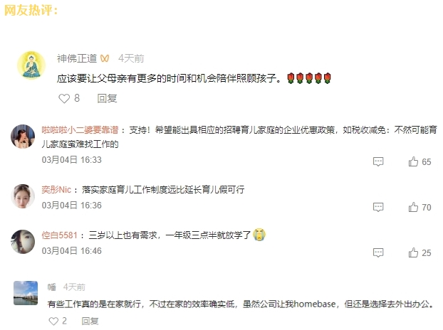 全国政协委员,江西省政府副省长,农工党中央常委、江西省委会主委史可:为缓解企业员工职业发展和育儿的压力与冲突,针对0-3岁幼儿抚养、育龄家庭休假制度落实方面,建议对育儿家庭员工引入弹性出勤制度,探索育儿家庭每周一天居家办公、远程办公工作模式,加强对企业尤其是中小微企业在产假保护和女性劳动权益方面的监管,完善男性在陪产、育儿等方面的政策保障措施。
