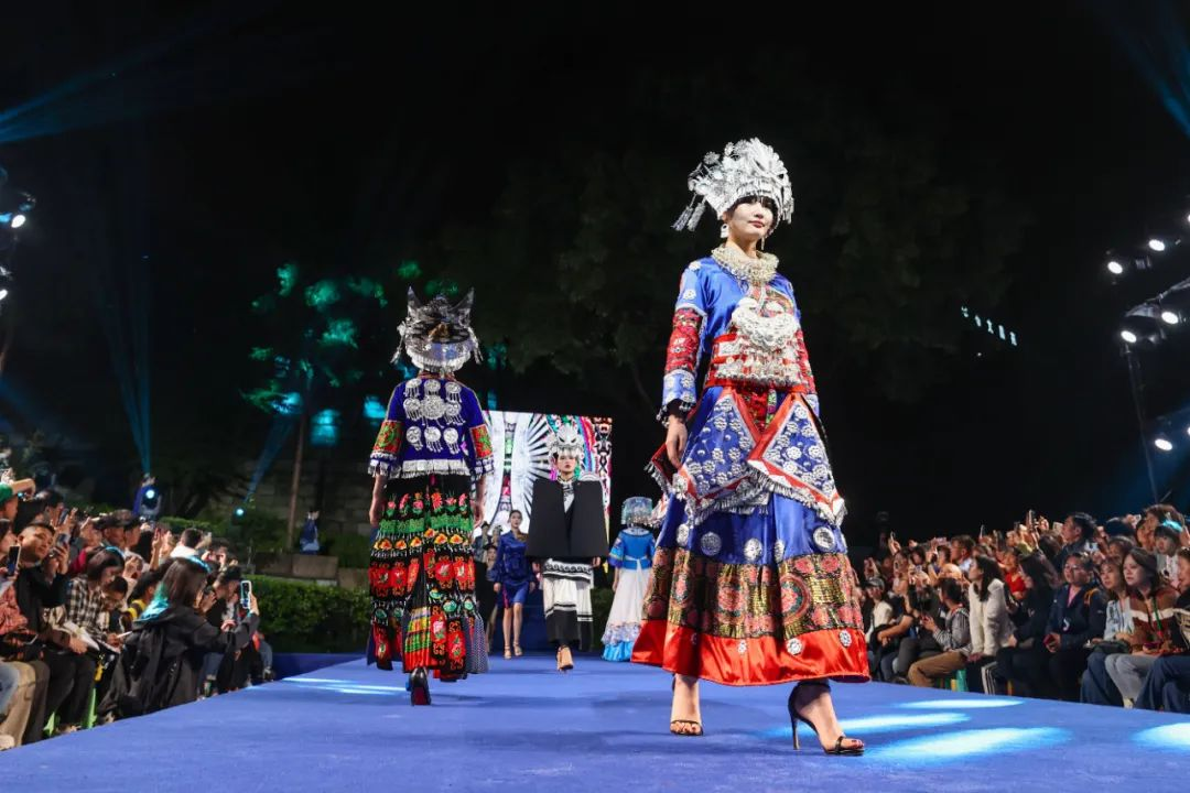 第三篇章,美美与共,传民族服饰风韵,贵州民族大学美术学院服装与服饰设计系老师和同学的非遗系列作品悉数登场,将蜡染、侗绣等非遗工艺,银饰、戏曲等传统元素融入现代服装之中,让传统与时尚的碰撞,少数民族服饰传承与创新,推动民族服饰传统元素焕发活力。
