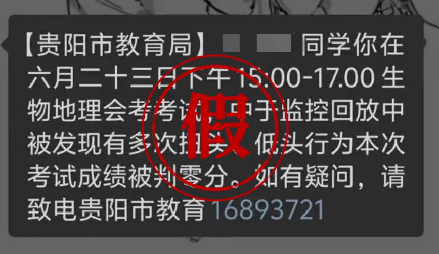 近日,贵阳市教育局收到学生家长反映,称接到短信告知孩子在中考中存在疑似作弊行为,成绩被判零分,并附有联系电话。