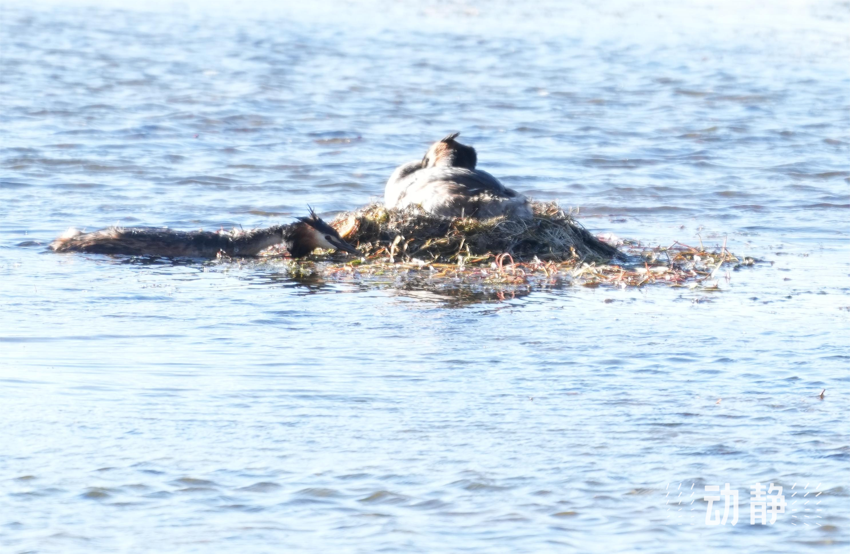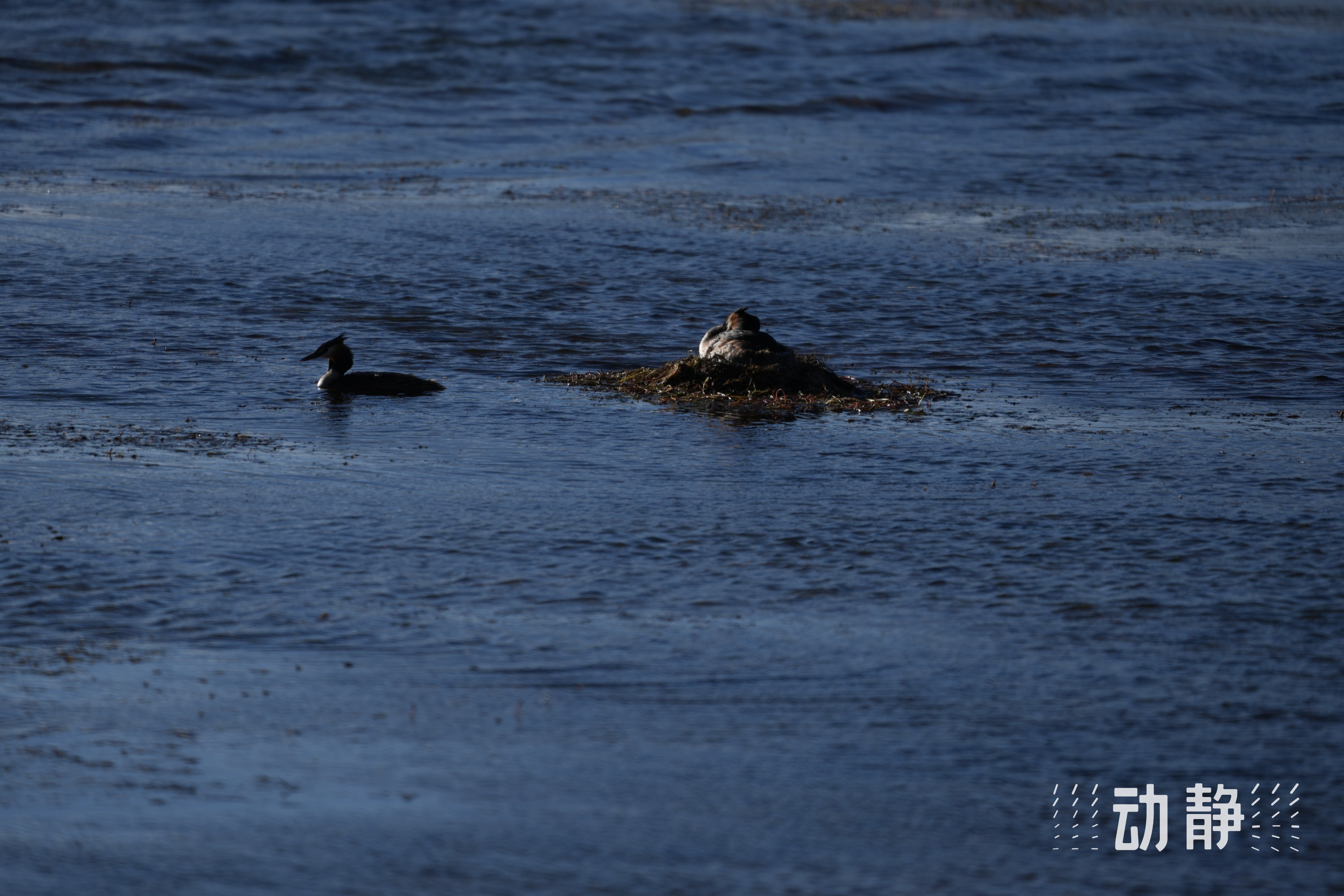 特别是在定结的湿地,我看到好几只凤头䴙䴘在抱窝孵蛋。它们的巢比较简单,像是漂浮在水面上的一样。筑巢的材料就是湿地中的水草,因为茎中空,有浮力,可以支撑巢浮在水面。我想一定也有与底部连接的水草,不然那巢会随风浪漂来漂去。孵蛋的凤头䴙䴘趴在巢里一动不动,另一只凤头䴙䴘在巢边游来游去,守护着巢的安全,时不时找来小鱼喂给抱窝的凤头䴙䴘,很是温馨。这种在南方越冬,在北方或高原繁殖的凤头䴙䴘,我曾经只见过越冬时候的自由自在与我行我素,还是第一次在繁殖期间看到如此温情场面。