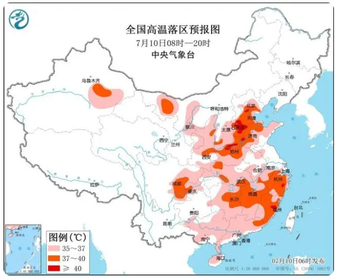 据中国天气网7月10日报道,中央气象台7月10日06时继续发布高温橙色预警:预计7月10日白天,西北地区东部、华北大部、黄淮、江汉、江南、华南大部以及四川盆地等地有35℃以上的高温天气,其中,华北东部、黄淮中北部、江南中北部和东部及四川盆地中南部等地部分地区最高气温37~39℃,北京东南部、河北南部、河南北部及浙江东部、福建东部等局地可达40℃以上。