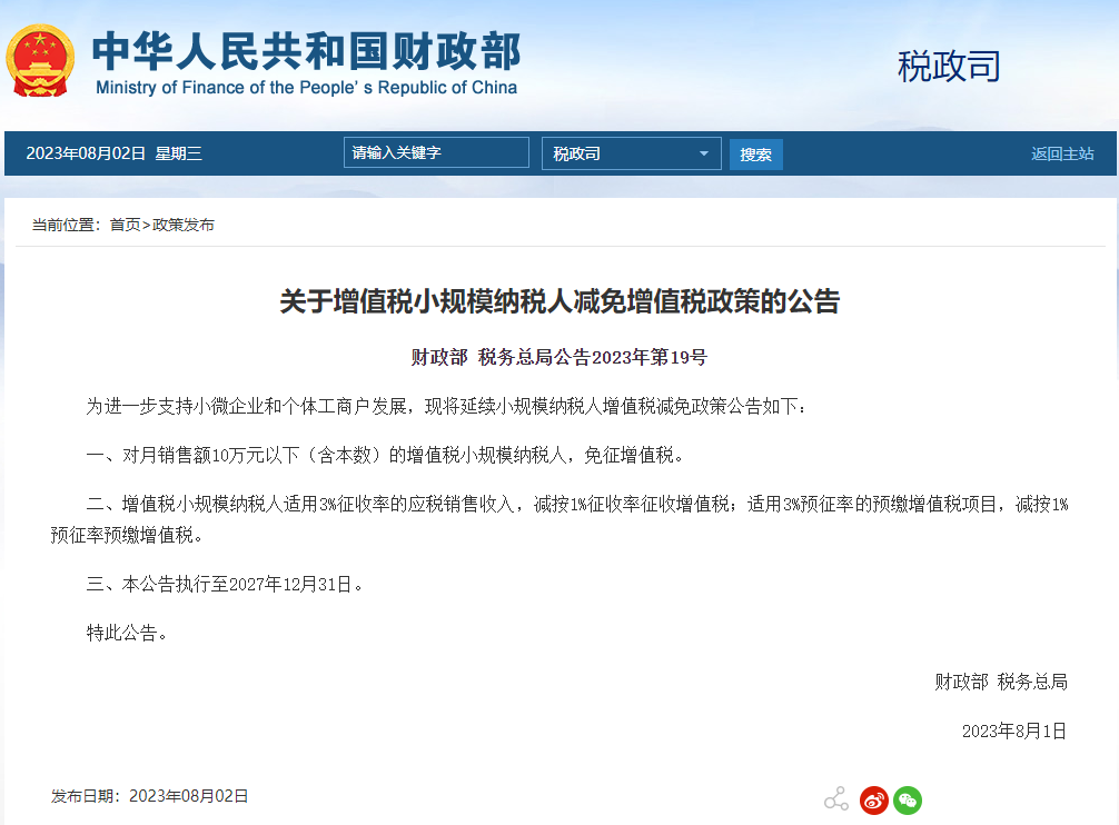 据财政部网站8月2日消息,财政部、税务总局发布《关于增值税小规模纳税人减免增值税政策的公告》,为进一步支持小微企业和个体工商户发展,现将延续小规模纳税人增值税减免政策公告如下: