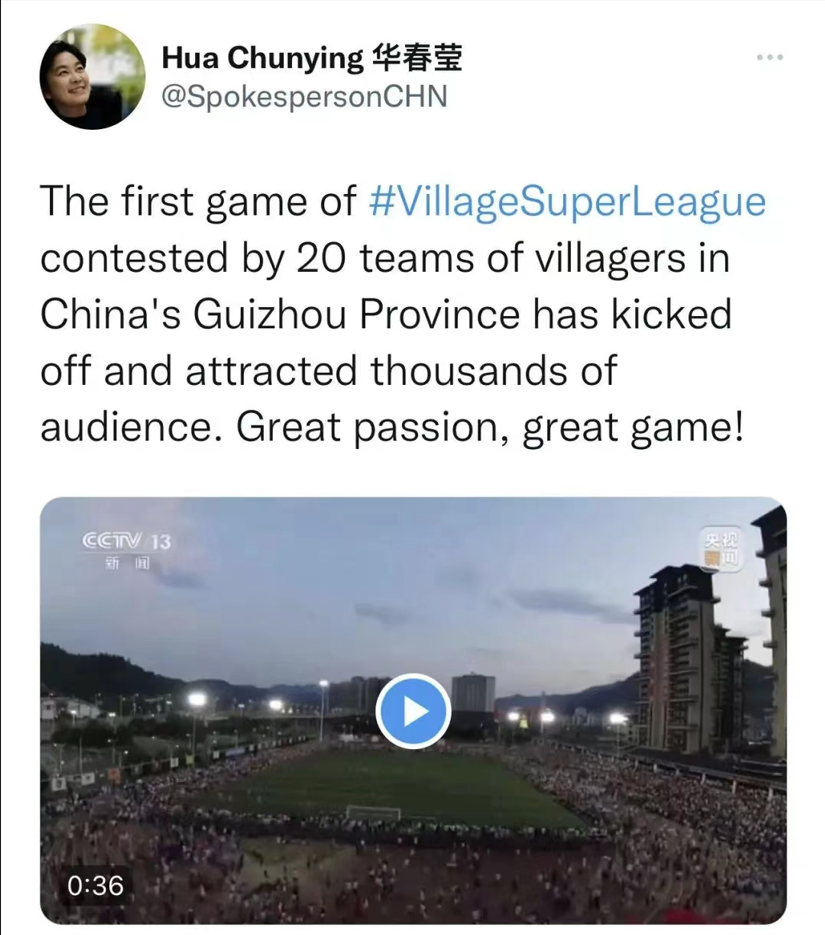 华春莹在推文里写道:“首届‘村超’在中国贵州省开踢,吸引了成千上万名观众观看。本届‘村超’共有榕江当地20支队伍参加。激情四射!比赛精彩!”