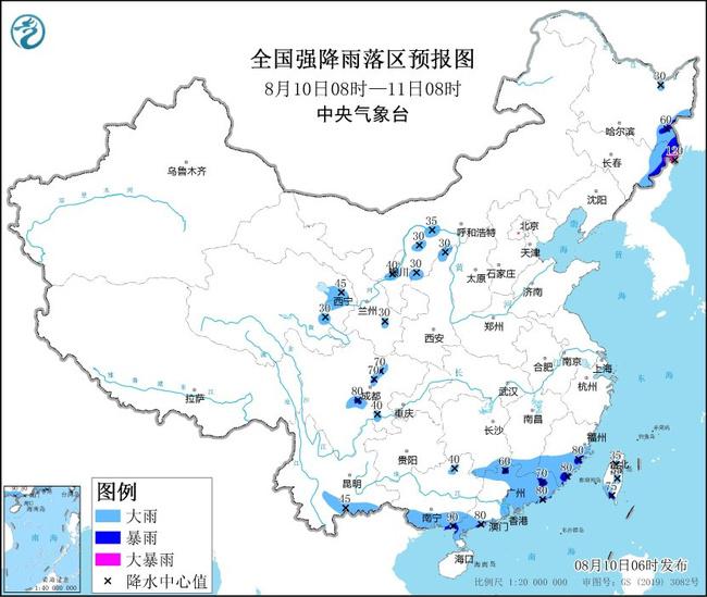 中央气象台8月10日06时发布暴雨蓝色预警:预计,8月10日08时至11日08时,黑龙江东部、吉林东部、青海东部、甘肃东部、宁夏、陕西北部、内蒙古河套地区、四川盆地西部和南部、湖南南部、江西南部、福建东部和南部、广东、广西南部、云南东南部、台湾岛中南部等地的部分地区有大到暴雨,其中,吉林东北部等地局部地区有大暴雨(100~120毫米)。上述部分地区伴有短时强降水(最大小时降雨量20~50毫米,局地可超过60毫米),局地有雷暴大风等强对流天气。