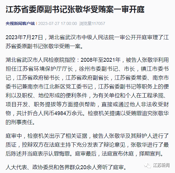 2023年7月27日,湖北省武汉市中级人民法院一审公开开庭审理了江苏省委原副书记张敬华受贿一案。