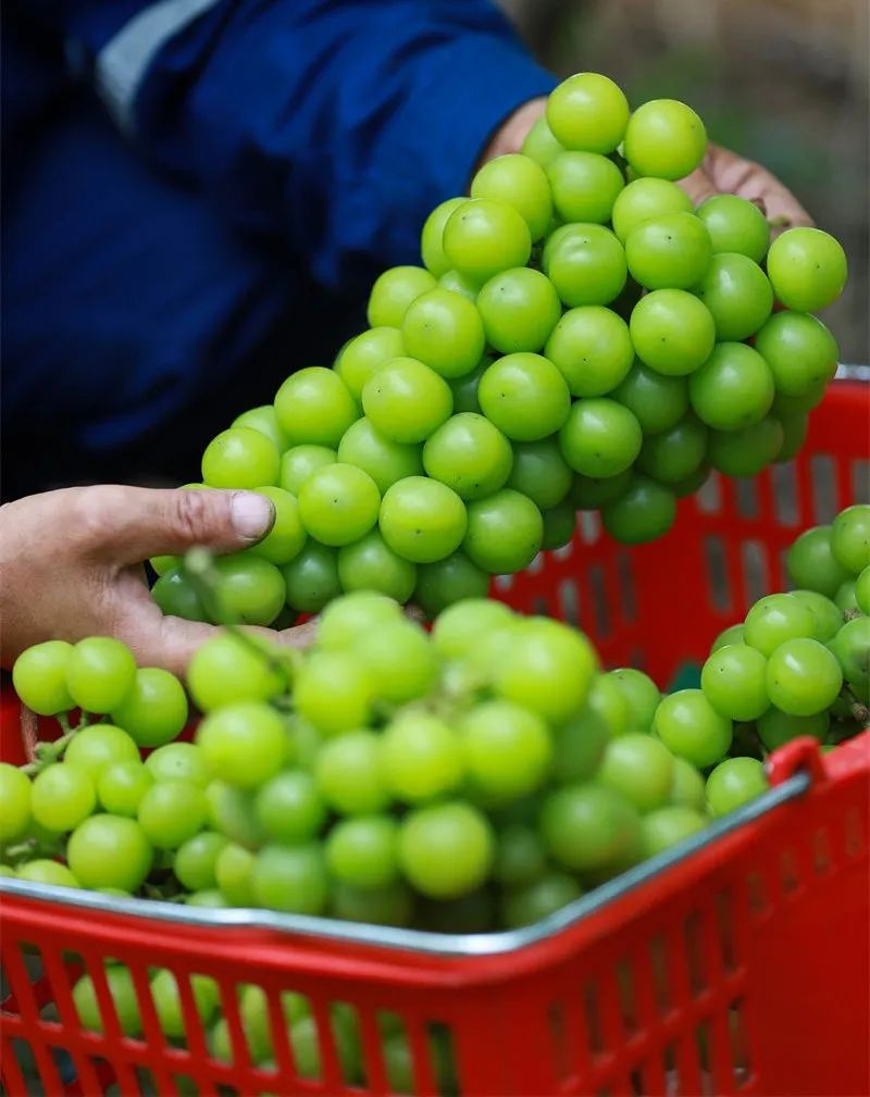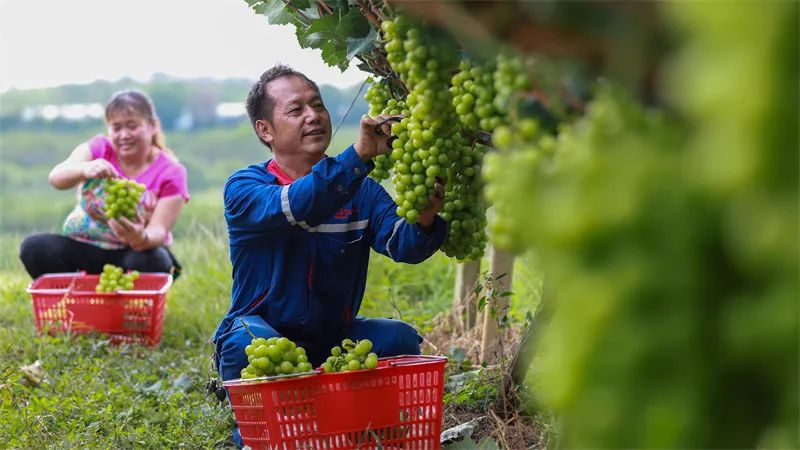 走进葡萄园,一串串颗粒饱满、晶莹剔透的阳光玫瑰葡萄挂满枝头,散发着浓郁的玫瑰清香。葡萄树下,龙成树正和家人一起采摘葡萄,准备装箱出售。