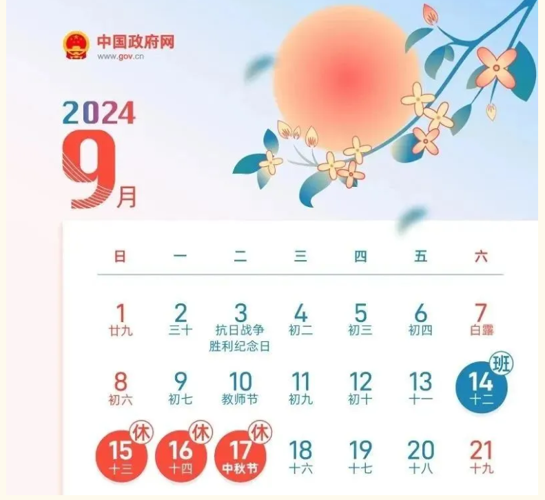 根据《国务院办公厅关于2024年部分节假日安排的通知》,2024年中秋节的放假调休安排如下:9月15日至17日放假调休,共3天。9月14日(星期六)上班。