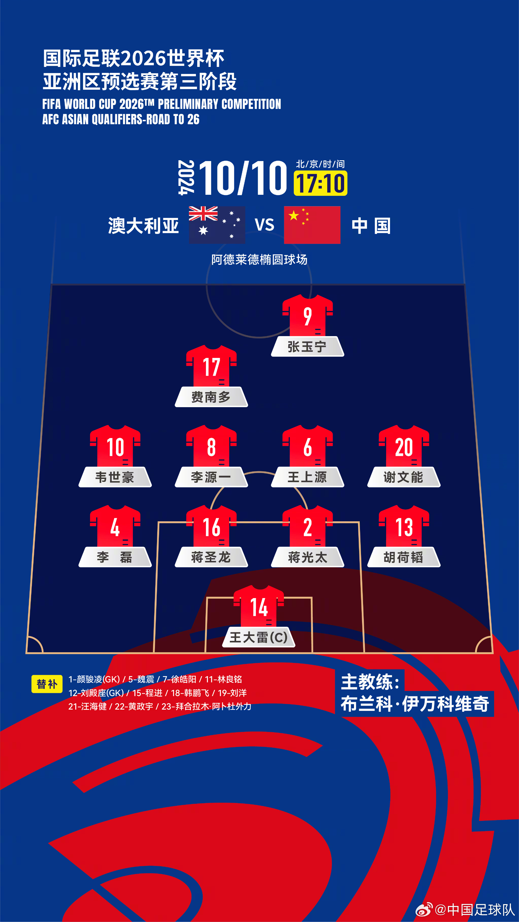 北京时间17时10分,2026年世界杯亚洲区预选赛18强赛将迎来第三轮比赛,中国男足将在阿德莱德椭圆球场对阵澳大利亚队。目前,双方首发已经公布,首次入选国家队的后卫胡荷韬迎来首秀。