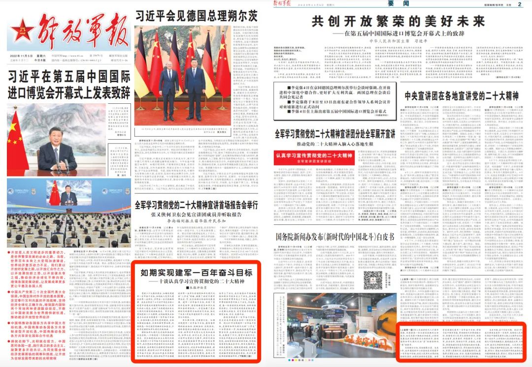 党的二十大报告提出,如期实现建军一百年奋斗目标,加快把人民军队建成世界一流军队,并作出一系列战略部署。这充分彰显了以习近平同志为核心的党中央建设巩固国防和强大人民军队的决心意志,反映了全面建设社会主义现代化国家的战略要求。学习宣传贯彻党的二十大精神,必须把聚焦点和着力点放在实现建军一百年奋斗目标上,全面加强人民军队党的建设,全面加强练兵备战,全面加强军事治理,巩固提高一体化国家战略体系和能力,不断开创国防和军队现代化新局面。