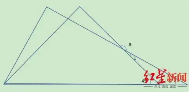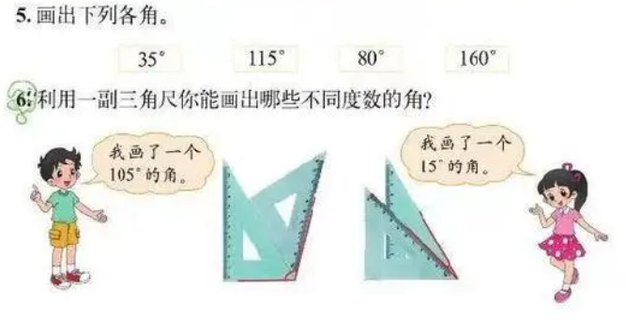 于是,米之贤上讲台展示了自己的做法。他把矮胖三角尺(等腰直角三角形)45°的一条边和瘦长三角尺60°的一条边重合,在右上方,就出现了一个钝角。用量角器测量,果真是165°!